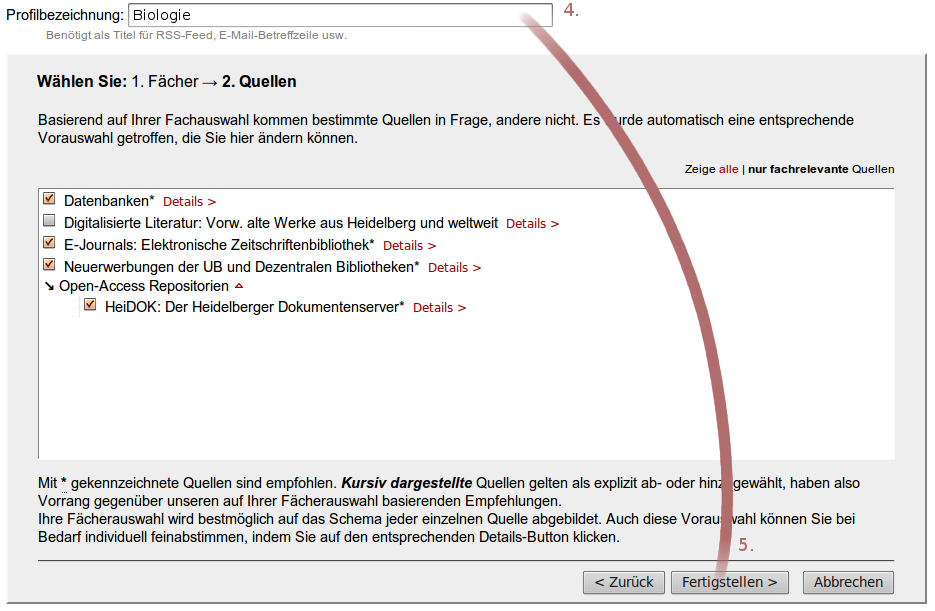 Mit Profilen steuern Sie, welche Titel Ihnen MyUB-Info liefert. Entsprechend Ihrer Interessengebiete können Sie dafür die gewünschten Fächer auswählen. Anschließend sehen Sie, welche Quellen passende Titel liefern. Sie können Quellen bei Bedarf ab- bzw. hinzuwählen.