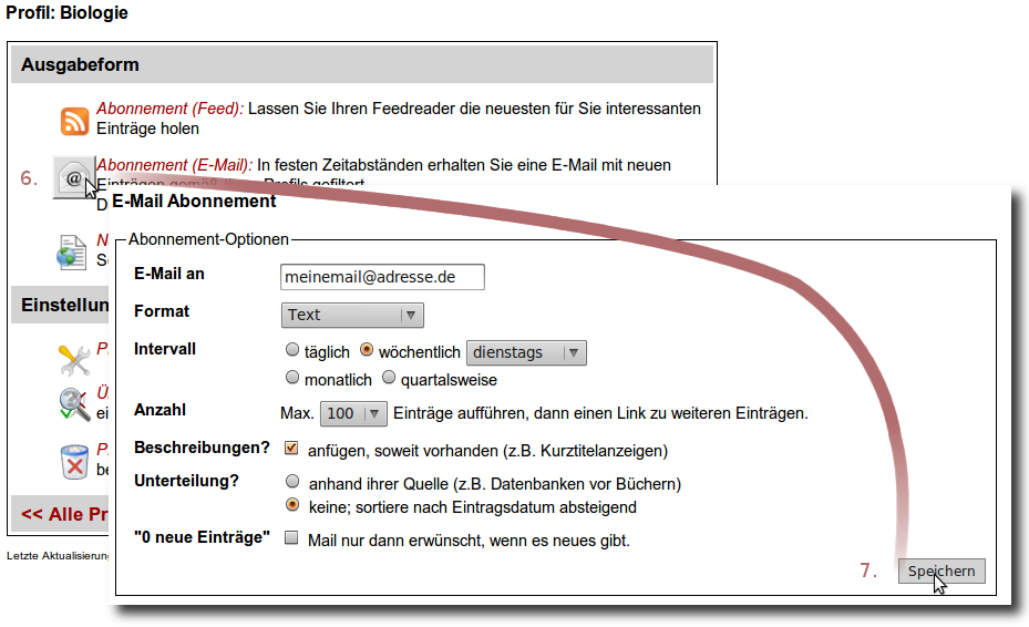 - 7.) klicken Sie auf "Speichern", um regelmäßig neue Titel per E-Mail gemeldet zu bekommen. Alternativ können Sie das Profil über Ihren RSS-Feedreader abonnieren oder sich neue Titel per Browser anzeigen lassen.